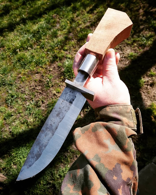 A megeresztés után nem találtam elég egyenesnek, ezért egy fa deszkán próbáltam kiegyengetni. De csak annyit tapasztaltam, hogy a meglendített 1,5 kg-os kalapácsot, az acél, majdnem ugyanolyan magasra lökte vissza, mint ahonnan indítottam az ütéseket. Szóval meg voltam elégedve a hőkezeléssel. Hozzá képest a csiszolás, egy könnyű ujjgyakorlat volt. Szerettem ezt a kést készíteni, és a forma is megtetszett. Lehet hogy a közeljövőben, el fogom készíteni a saját változatomat is. Addig meg gyűjtöm a visszajelzéseket, a gazdájától. Remélem nem kíméli, hiszen mégiscsak egy régi vágású japán vadászkés van a kezében. Én meg ezen információk fényében fogom elkészíteni a következő késem. Bár lehet hogy hozzá kellene fognom, egy konyhakés, egy bugylibicska, egy lyukaspengés bushcraftkés, és egy orosz fekete kés készítésbe. Úgy vélem ezen kések után fogok, csak hozzá majd a sajátomhoz.