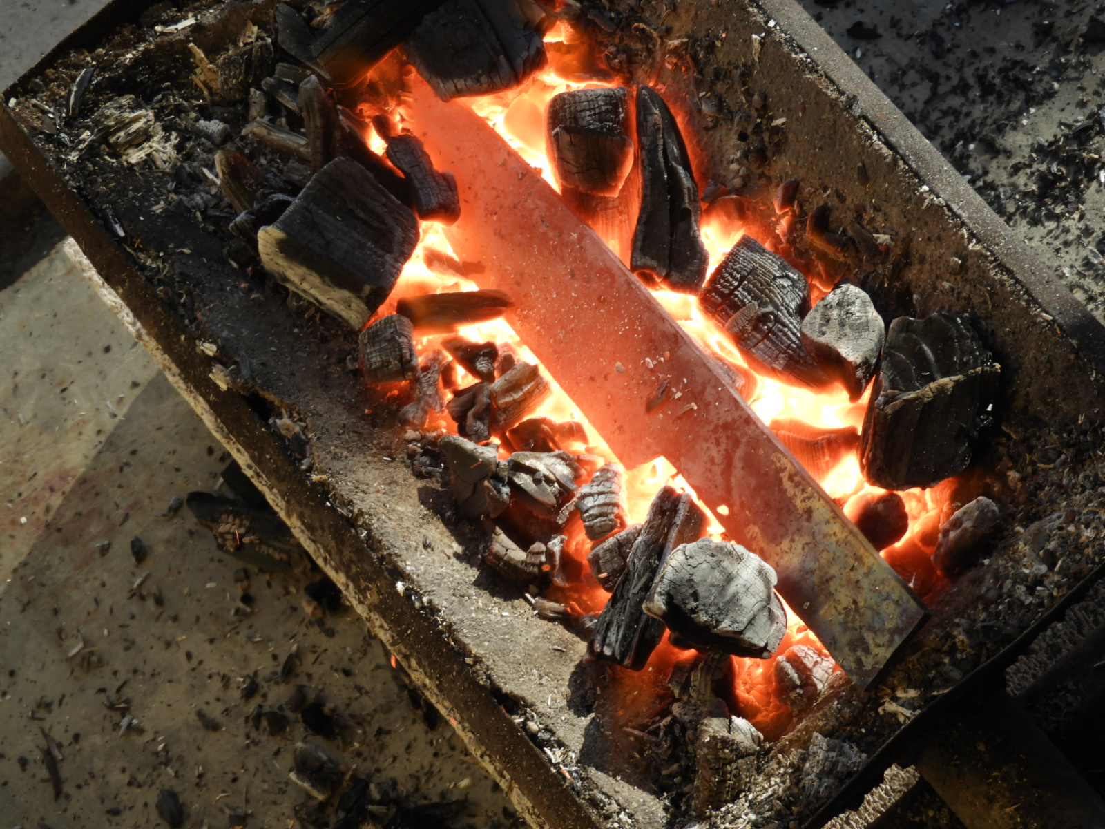 Csiszoláskor pedig egészen jól viseli a nagyobb szalagsebességet is. Kivéve a bütü részen. Itt kimondottan igényli a reszelős , csiszolóvásznas, anyagleválasztást. Ha csiszolószsalaggal csináljuk, akkor sajnos egy másodperc után hajlamos megégni. Na de a pengéről is ejtenék egy pár szót. Az anyag 12C27 Sandvik rozsdamentes acél. Azon kevés (rm) acélok közé tartozik, amik, el tudják viselni a kovácsolásnál keletkező morfózisokat. Tudom a szénacélok toleránsabbak ilyen téren, de ezt ki kellett próbálnom egy (rm) acélon is. Magát a kovácsolás folyamatát nem fotóztam, kameráztam le, mert avval tele van a vezető videómegosztó csatorna, és amúgy sem érdekel mindenkit. A lényeg az hogy nekem még mindig egy fenyőfa tuskóra, fordítva felhelyezett sínvas szolgál üllő gyanánt. Sőt még gömbölyítő kalapácsom sincsen. De ez akkor sem akadályoz meg abban, hogy megütögessem forrón az acélt. Nem kimondottan azért, hogy így alakítsam az acélt........ inkább a kovácsolt, strukturált felület elérése érdekében. Na de ne csak a szám járjon. Az alábbi képeken csak annyi látható, hogy milyen egyszerű eszközökkel oldom meg azt, hogy elérjem az 1000 C°-os hőmérsékletet. Bár az ütlegelést kicsit alacsonyabb, a hőkezelést pedig kicsit magasabb hőmérsékleten csináltam.